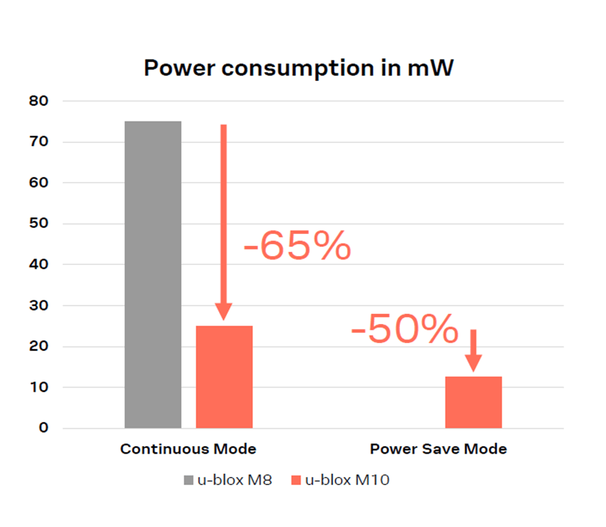 - 與上一代相比 u-blox M10僅消耗35%的功率