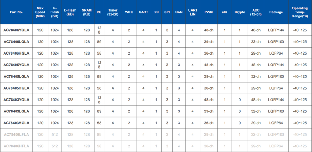 AC7840x是基于ARM Cortex-M4F內(nèi)核的車規(guī)級MCU,于2022年上市。產(chǎn)品符合AEC-Q100 Grade1, 功能安全符合ISO 26262 ASIL-B,信息安全符合SHE標(biāo)準(zhǔn),支持安全啟動。軟件生態(tài)支持AUTOSAR MCAL4.4,可提供MCAL及配置工具。產(chǎn)品擁有雙Bank Flash用于存儲程序,支持OTA。AC7840x可廣泛應(yīng)用于汽車車身、座艙、車燈、新能源以及電機(jī)控制等應(yīng)用領(lǐng)域。