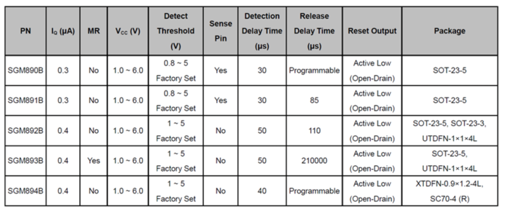 - 靈活可調(diào)的釋放延時(shí),可以實(shí)現(xiàn)系統(tǒng)復(fù)位功能(SGM890/4/5/6/7/8/9);