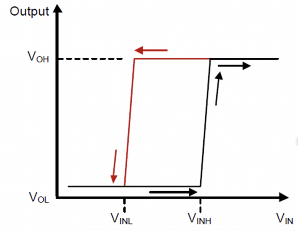 1. 欠壓保護(hù)+過門限打開功能:即輸入電壓高于VINH時(shí)打開DC/DC、LDO或負(fù)載開關(guān),接通后級(jí)負(fù)載供電;同時(shí)在電源電壓低于VINL時(shí)關(guān)閉DC/DC、LDO或負(fù)載開關(guān)以斷開負(fù)載供電。輸入電壓VIN和電壓監(jiān)控器輸出端OUT(即DC/DC、LDO或負(fù)載開關(guān)的EN)的邏輯關(guān)系如下,從圖中可以看出該電路實(shí)現(xiàn)一個(gè)遲滯比較器的功能。