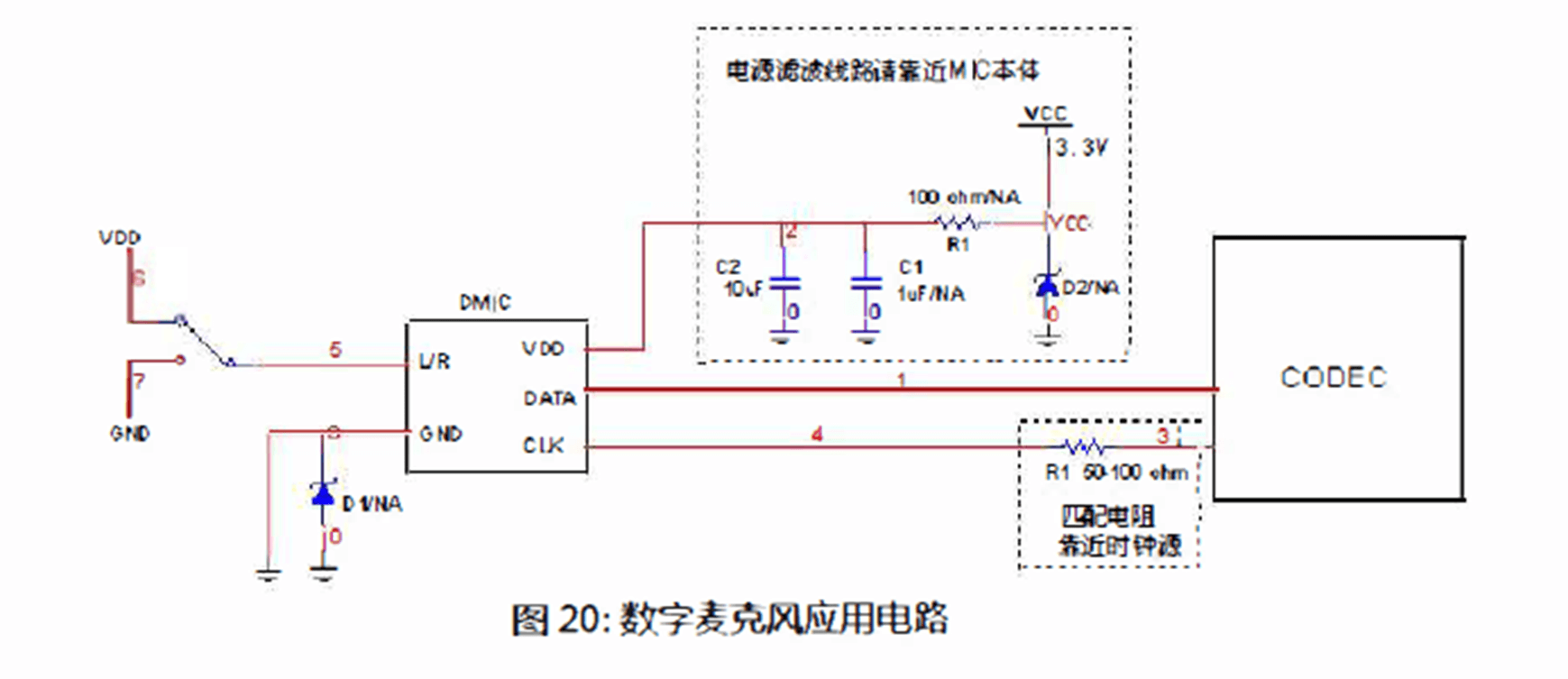 - 建議在靠近每個麥克風(fēng)VDD端放置一個0.1-1 uF電容 , 消除電源紋波