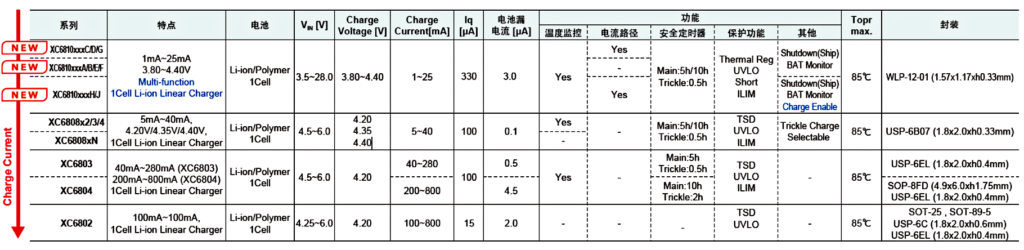 - XC6803/XC6804: CC/CV Charger, CC=~280/800mA,電池溫度監(jiān)測(cè)