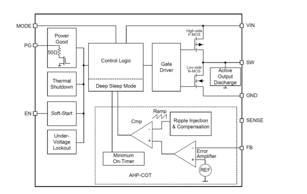 AHP-COT控制架構(gòu)實現(xiàn)超快的負(fù)載瞬態(tài)響應(yīng),保證VOUT較小的電壓降。