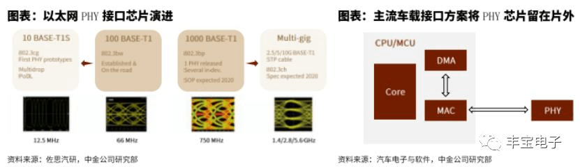 車(chē)載以太網(wǎng)目前已廣泛布局各車(chē)型中,深入ADAS系統(tǒng)。在硬件層面,車(chē)載以太網(wǎng)的接口電路主要由MAC控制器和物理層接口PHY芯片兩大部分構(gòu)成。集成方式上,嵌入式芯片廠(chǎng)商一般會(huì)將MAC集成在MCU/CPU內(nèi)部,而PHY芯片則由OEM或控制器供應(yīng)商提供獨(dú)立芯片。PHY與MAC之間通過(guò)MII接口(media independent interface,媒體獨(dú)立接口),在MAC結(jié)構(gòu)不發(fā)生變化的情況下,更換不同PHY芯片不會(huì)影響車(chē)內(nèi)通信。