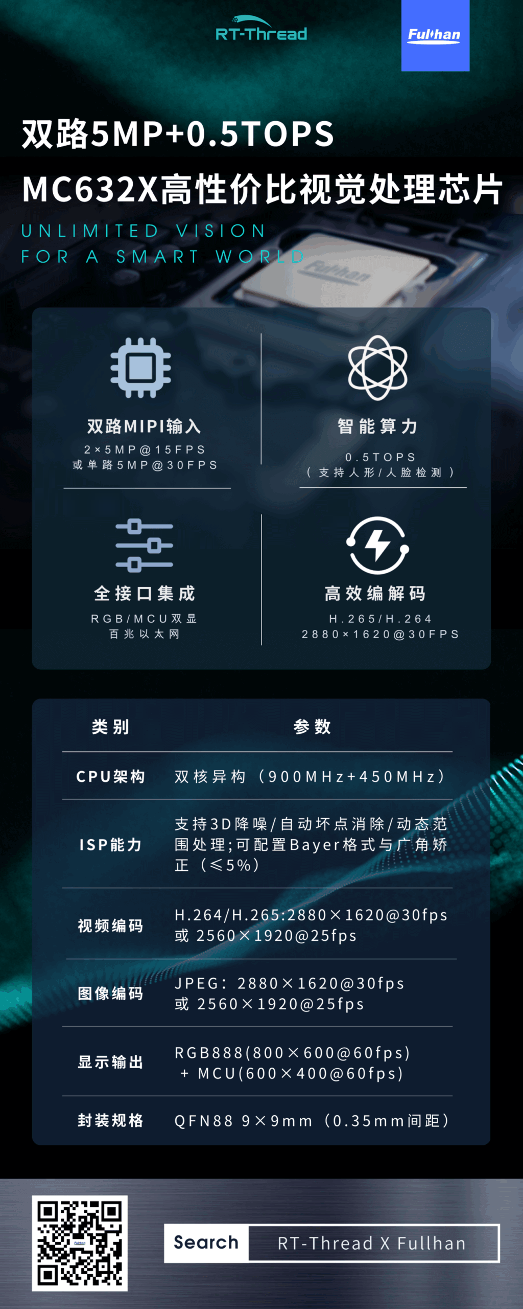 在智能視覺技術(shù)高速發(fā)展的浪潮中,行業(yè)對芯片性能、能效比和開發(fā)效率的需求正呈現(xiàn)爆發(fā)式增長。面對多路高清視頻處理、實時智能分析和快速產(chǎn)品化落地的三重挑戰(zhàn),RT-Thread操作系統(tǒng)攜手MC632X智能視覺處理器,帶來了突破性的解決方案。MC632X憑借高效快速、雙路顯示、全場景適配三大核心優(yōu)勢重新定義邊緣視覺處理。