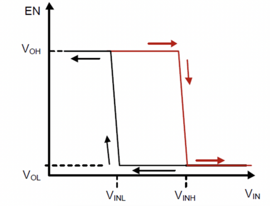 2. 過壓關(guān)斷+遲滯打開功能:即輸入電壓高于VINH時(shí)關(guān)斷DC/DC、LDO或負(fù)載開關(guān),斷開后級(jí)負(fù)載供電;同時(shí)在電源電壓低于VINL時(shí)打開DC/DC、LDO或負(fù)載開關(guān)以接通負(fù)載供電。輸入電壓VIN和DC/DC、LDO或負(fù)載開關(guān)使能端EN的邏輯關(guān)系如下,從圖中可以看出該電路實(shí)現(xiàn)一個(gè)遲滯比較器的功能。