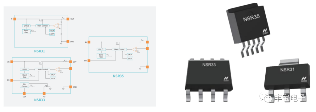 NSR31/33/35系列提供給硬件設(shè)計者充足的解決方案,有各種固定電壓版本:2.5V、3.3V和5.0V,也提供輸出可調(diào)選項(0.65V至18V)。此外,不同系列分別提供150mA,300mA,500mA的輸出電流能力,可由芯片內(nèi)部限制。此低功耗線性調(diào)節(jié)器還內(nèi)部集成了短路保護(hù)、過溫保護(hù)功能。 這些器件可在-40℃至125℃的環(huán)境溫度下運行,提供多種封裝SOT223,SOT23DFN-8, MSOP-8 EP, SOP-8EP,TO252, TO263等,滿足不同設(shè)計需求。