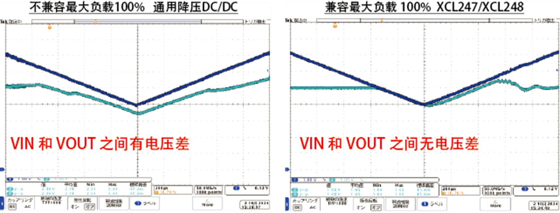 XCL247/XCL248系列采用的是P溝道驅(qū)動FET,替代高壓DC/DC轉(zhuǎn)換器中常用的N溝道驅(qū)動FET,實現(xiàn)了100%占空比對應。即使在輸入電壓低于輸出電壓設定值時,仍可直接導通輸入電壓進行輸出。這使得在輸入輸出電壓差較小的工況下也能安心使用(圖4)。此外,通過搭載提示輸出電壓穩(wěn)定狀態(tài)的PowerGood功能與啟動時軟啟動功能,可滿足工業(yè)設備對后級負載系統(tǒng)電源時序控制的高要求。