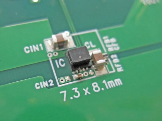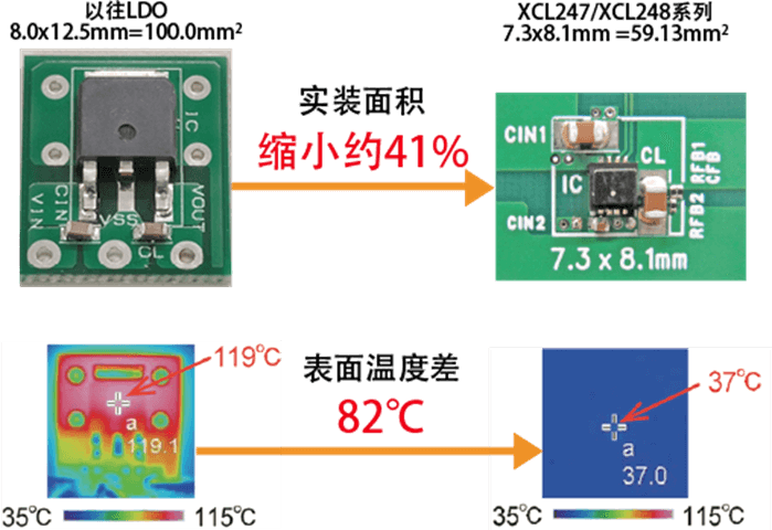 XCL247/XCL248的最大特點是兼具36V高耐壓與超省空間設計(圖1),且消耗電流僅為11μA。在VIN=12V、VOUT=5V、IOUT=1mA條件下效率達86%,IOUT=300mA時效率提升至88%,實現(xiàn)了從輕載到重載全范圍的高效運行(圖2)。通過活用這一省空間與高能效特性,可將傳統(tǒng)大尺寸中高耐壓LDO替換為XCL247/XCL248,輕松解決IC發(fā)熱課題(圖3:8.0×12.5mm ? 7.3×8.1mm實現(xiàn)40%面積縮減,發(fā)熱對策示例)。